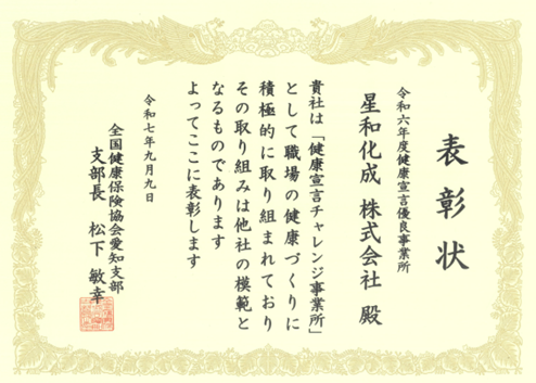 社員の健康づくり 弊社の取組が評価され「令和6年度健康宣言優良事業所」表彰を受け殿堂入りしました。